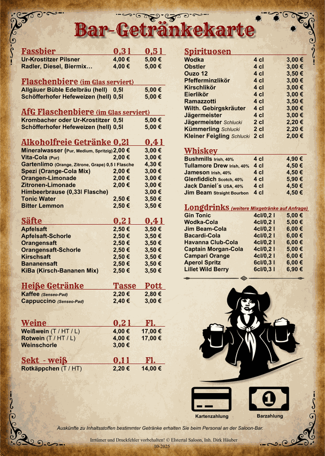 Der Elstertal Saloon verfügt über eine große Bar im Saloon. Das Getränkeangebot reicht von frisch gezapften Bier, alkoholfreien Bieren, üblichen Softdrinks bis hin zu Spirituosen, Whiskey, Longdrinks, Weinen und Sekt. Natürlich bieten wir auch heiße Getränke wie Kaffee, Tee, Heiße Schokolade und verschiedene alkoholische Heißgetränke für die kältere Jahreszeit an.